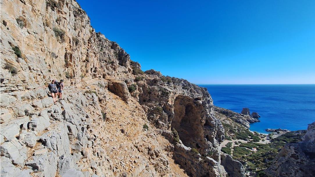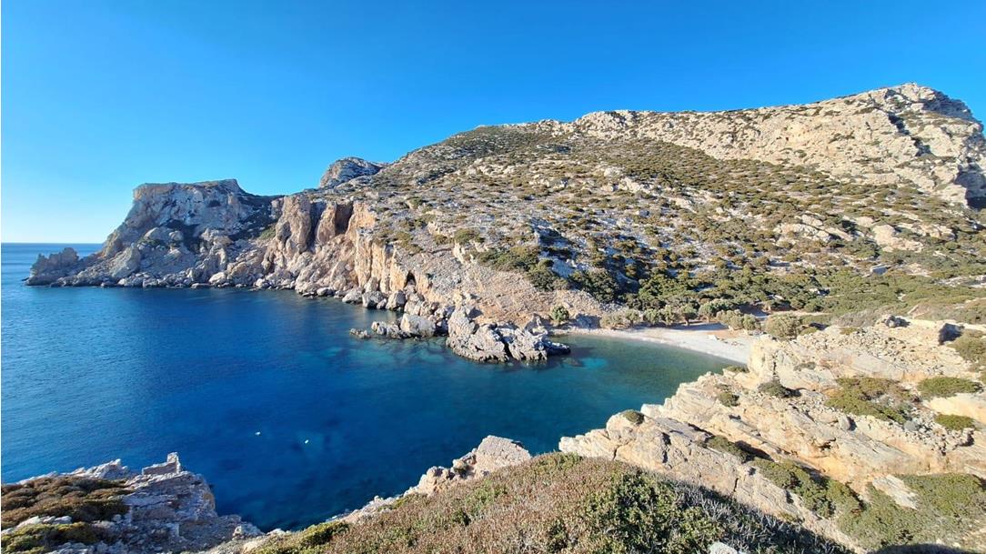 Die Insel zählt zu den ungezähmtesten Regionen der Ägäis: mächtige Gebirgszüge, zerklüftete Steilhänge und einsame Traumbuchten prägen das Bild. Immer wieder fällt die Felsküste spektakulär ins tiefblaue Meer ab, während im Zentrum der Insel der Kali Limni (1.215 m) als höchster Gipfel über die raue Landschaft wacht.