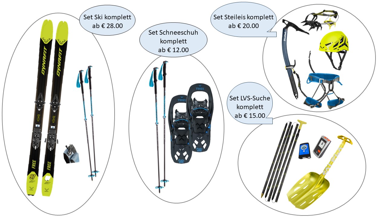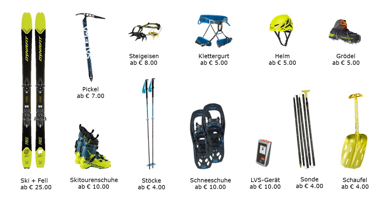 Im Winter stellen wir die gesamte Standard-Notfallausrüstung (LVS, Schaufel, Sonde), Skitouren-Leihset (Dynafit Tourenskier mit dazu passenden Spannklebefellen, Skistöcken, Tourenbindung, Skistopper, Harscheisen), Schneeschuhe, Grödel, Steigeisen und Pickel zur Verfügung. Die Skier werden individuell auf deine Körpergröße und -gewicht eingestellt nach jedem Verleih präpariert. ACHTUNG! Skitourenschuhe sind nicht im Verleih! Wir empfehlen den Skiverleih in Olang .