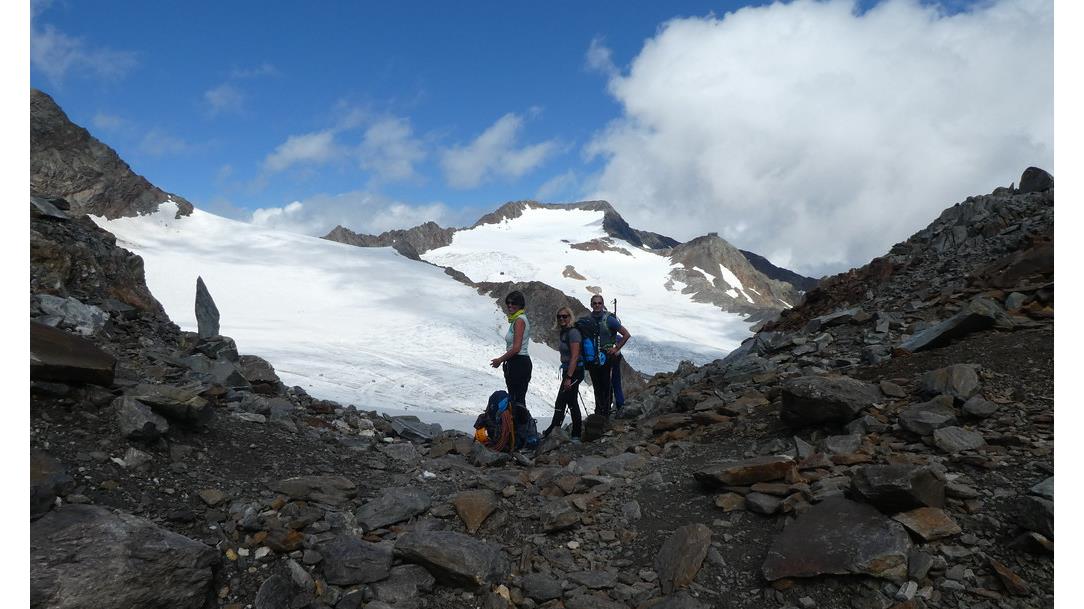 1. Tag: Treffpunkt und Materialkontrolle. Langer Aufstieg zur Müllerhütte, währenddessen wir uns bereits der Ausbildung widmen. (Anseilen am Gletscher, Gehen mit Steigeisen, Orientierung)