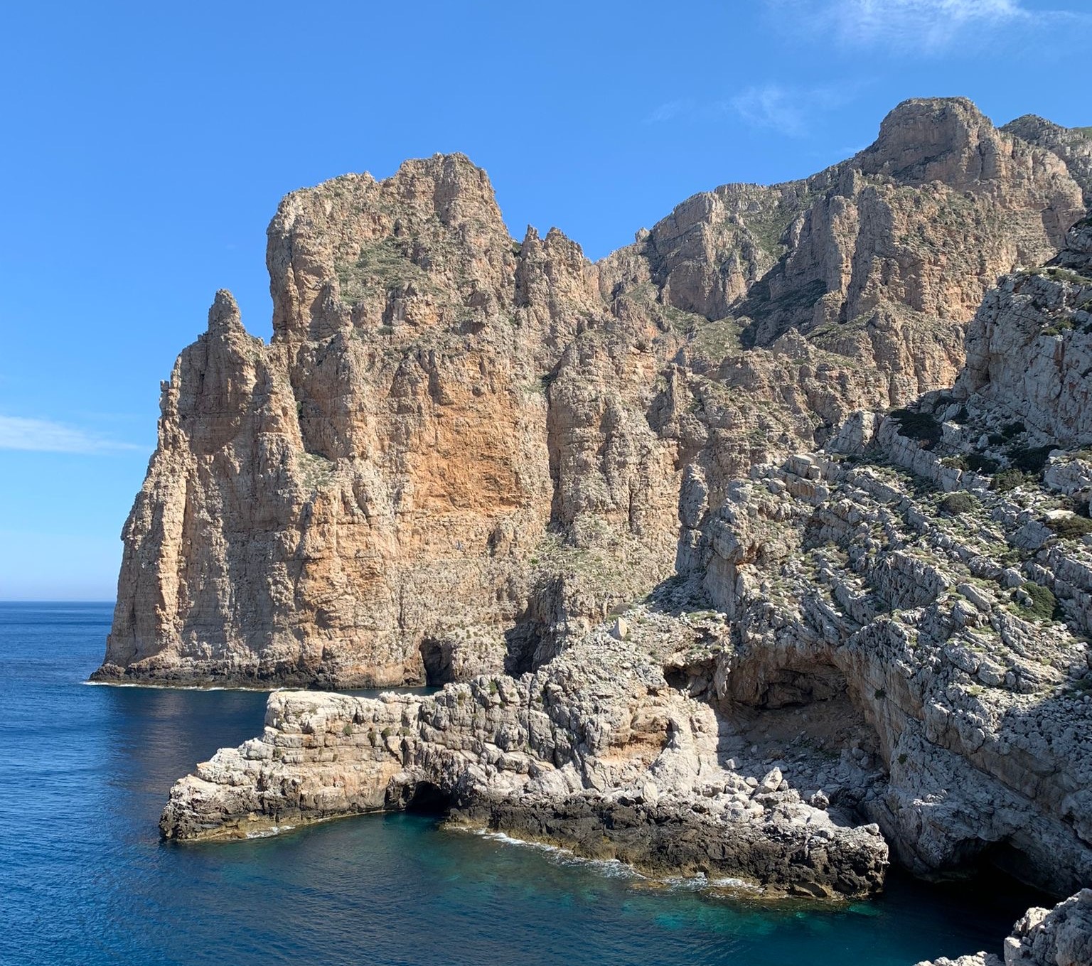 Die Südwestseite der Insel birgt an ihrer spektakulären Steilküste das größte geschützte Meeresreservat Europas und direkt darüber ragen die Felswände gegen Himmel. Es ist als wären Teile der Dolomiten im Meer versunken und nur die Gipfel und höchsten Felswände sind von den Fluten verschont geblieben. Das ist das Reich der wildlebenden Mufflons und ihren Spuren folgen wir auf ausgesetzten Felsbändern, ähnlich wie beim Bocchette Steig in der Brenta, aber ohne Stahlseil und dafür mit dem Meer unter den Sohlen. Hier ist das Paradies für alle Liebhaber der unberührten Natur in Verbindung von Berg, Steilküste und Meer.