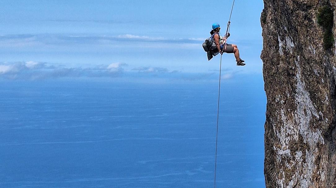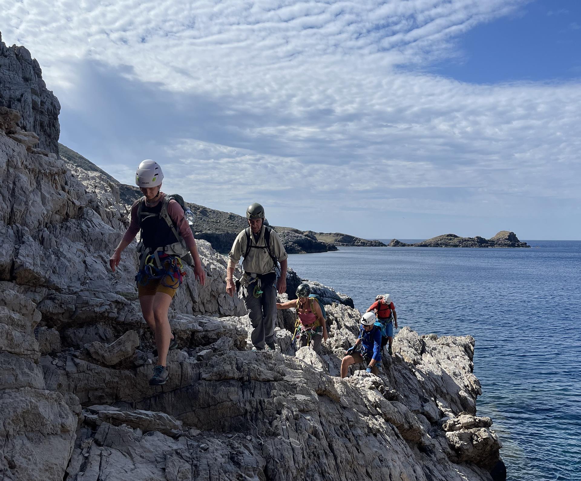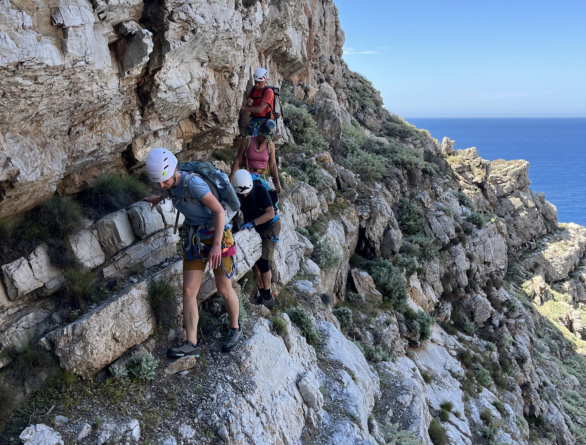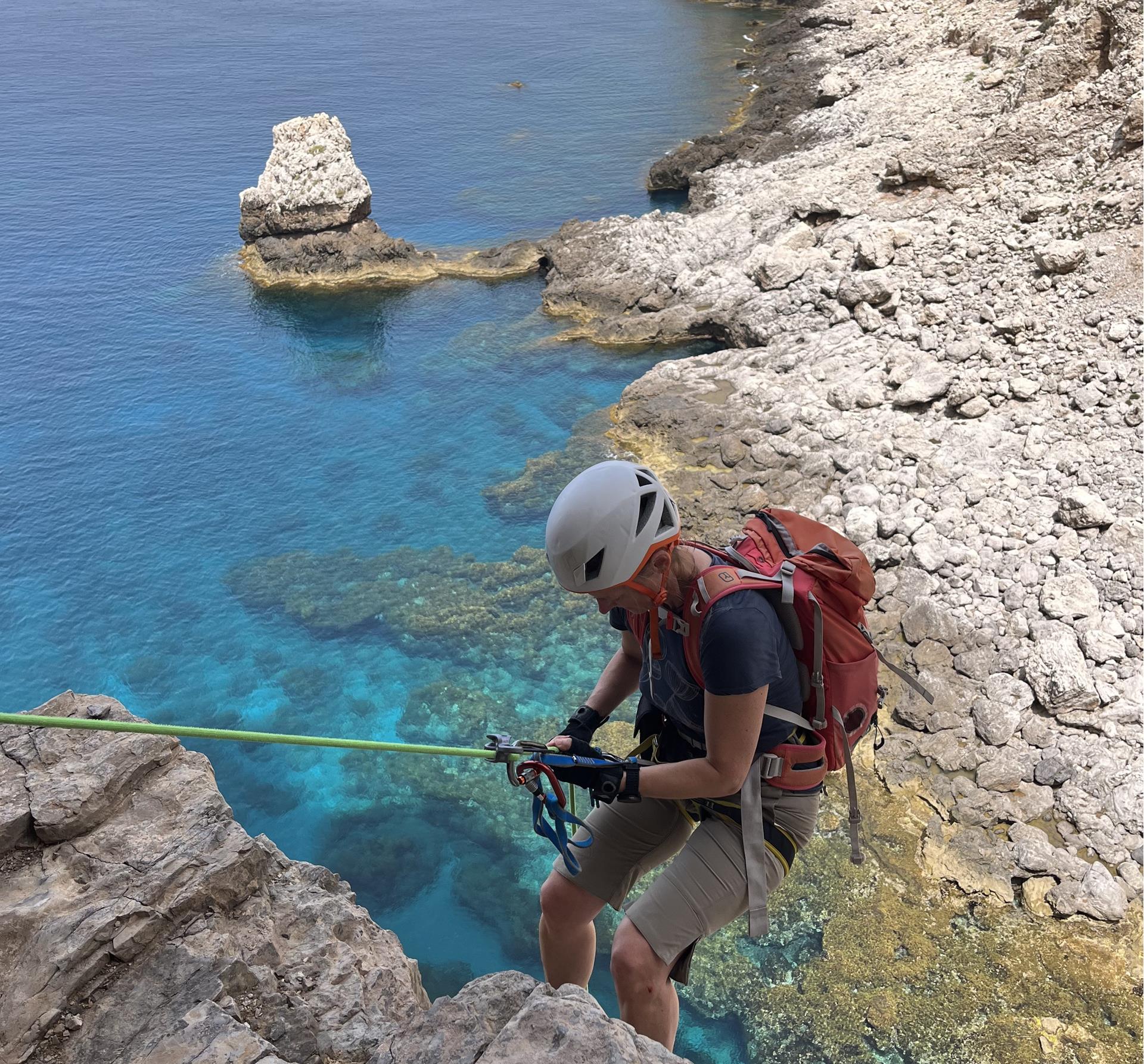 Mehrere Anläufe haben wir benötigt, um einen Weg durch diese wilde, unerschlossene Küstenlandschaft rund um die gesamte Insel zu finden. Einige Abseiler haben wir eingerichtet und es gilt einfache Kletterstellen zu bewältigen. Vor allem ist aber Schwindelfreiheit und Trittsicherheit angesagt, um auf den schmalen, ausgesetzten Bändern sicher unterwegs zu sein.