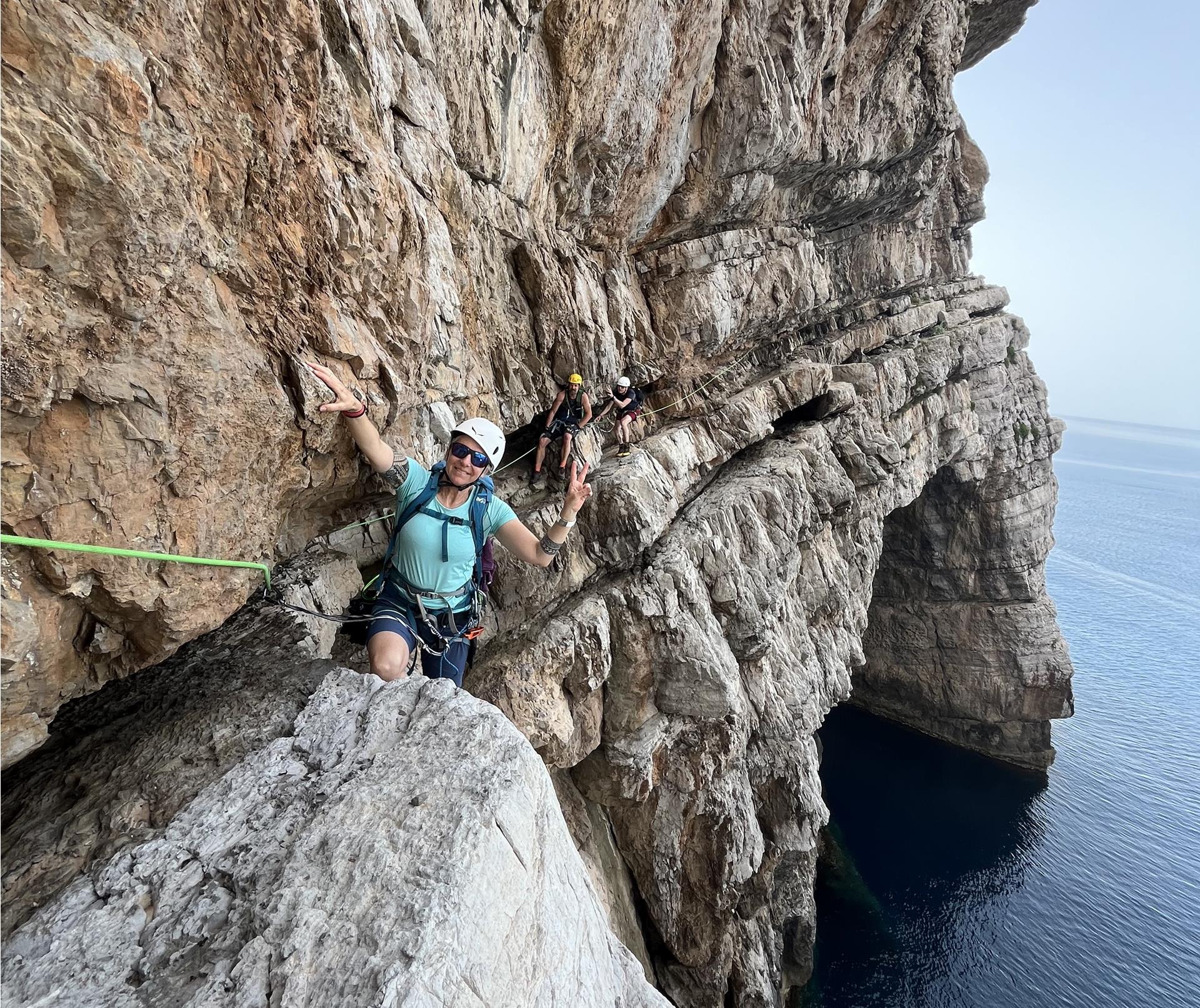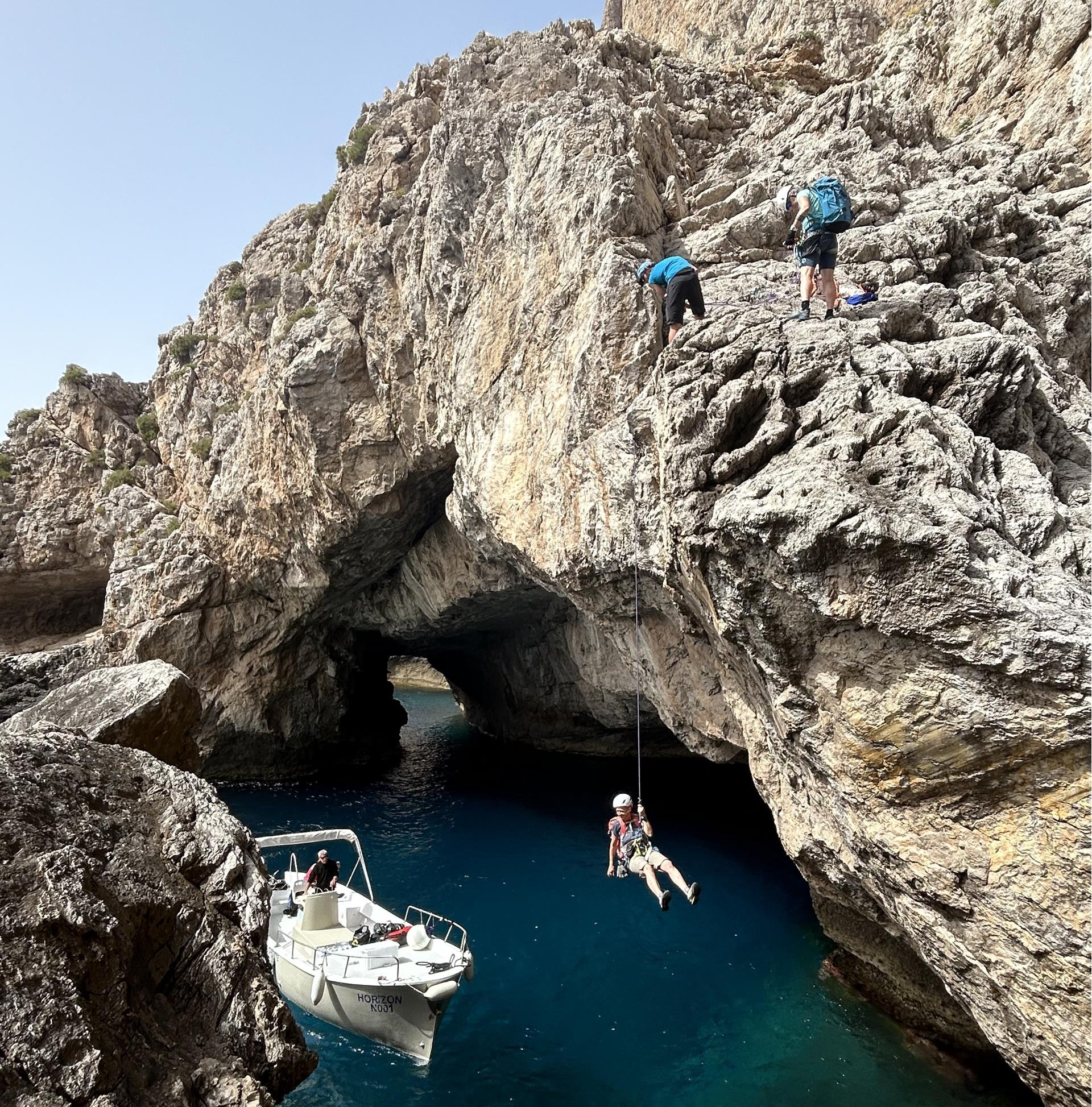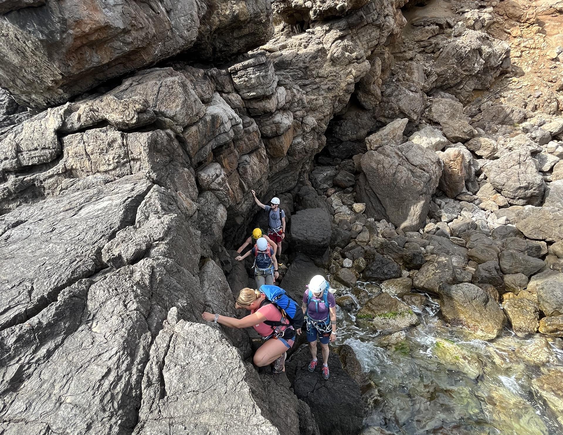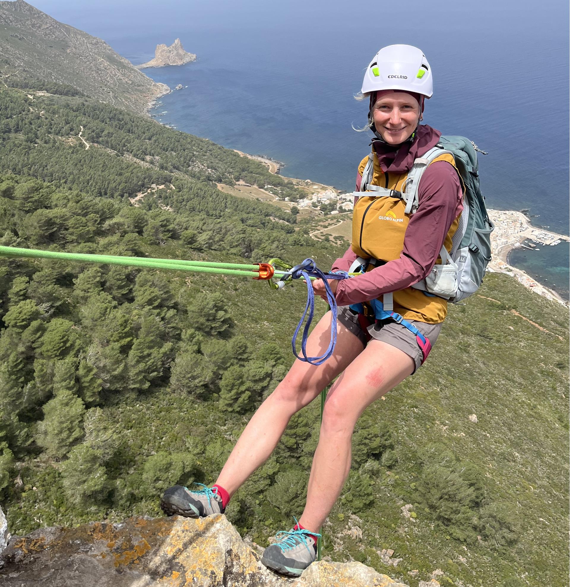 Mehrere Anläufe haben wir benötigt, um einen Weg durch diese wilde, unerschlossene Küstenlandschaft rund um die gesamte Insel zu finden. Einige Abseiler haben wir eingerichtet und es gilt einfache Kletterstellen zu bewältigen. Vor allem ist aber Schwindelfreiheit und Trittsicherheit angesagt, um auf den schmalen, ausgesetzten Bändern sicher unterwegs zu sein.