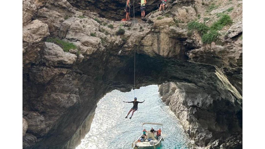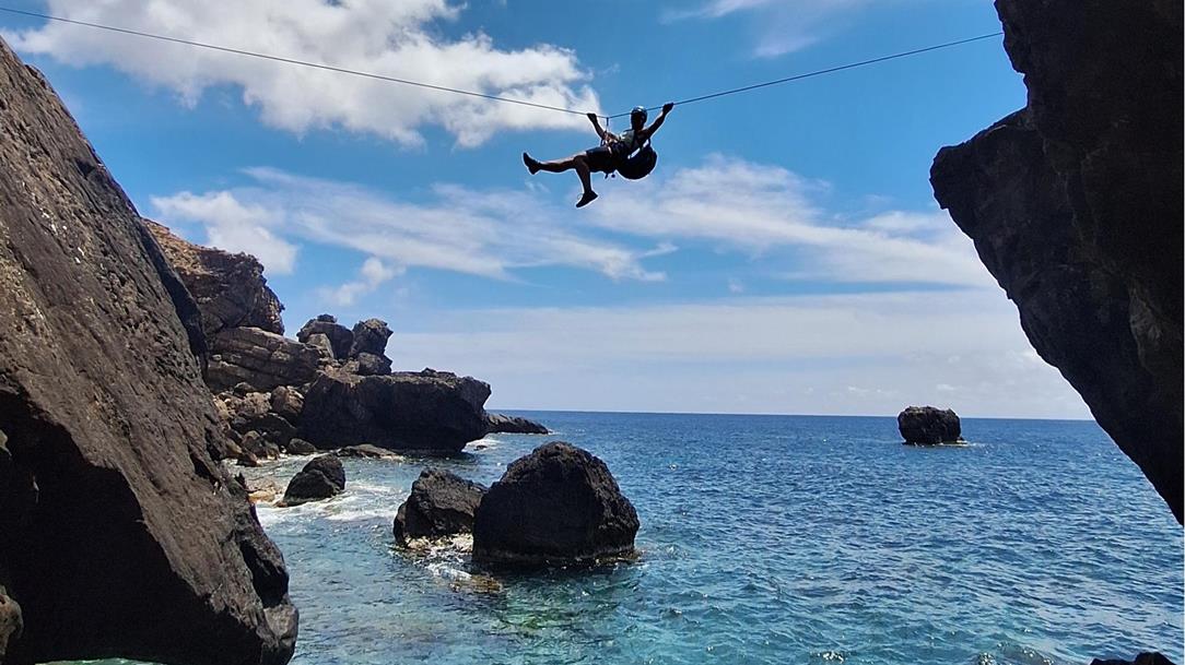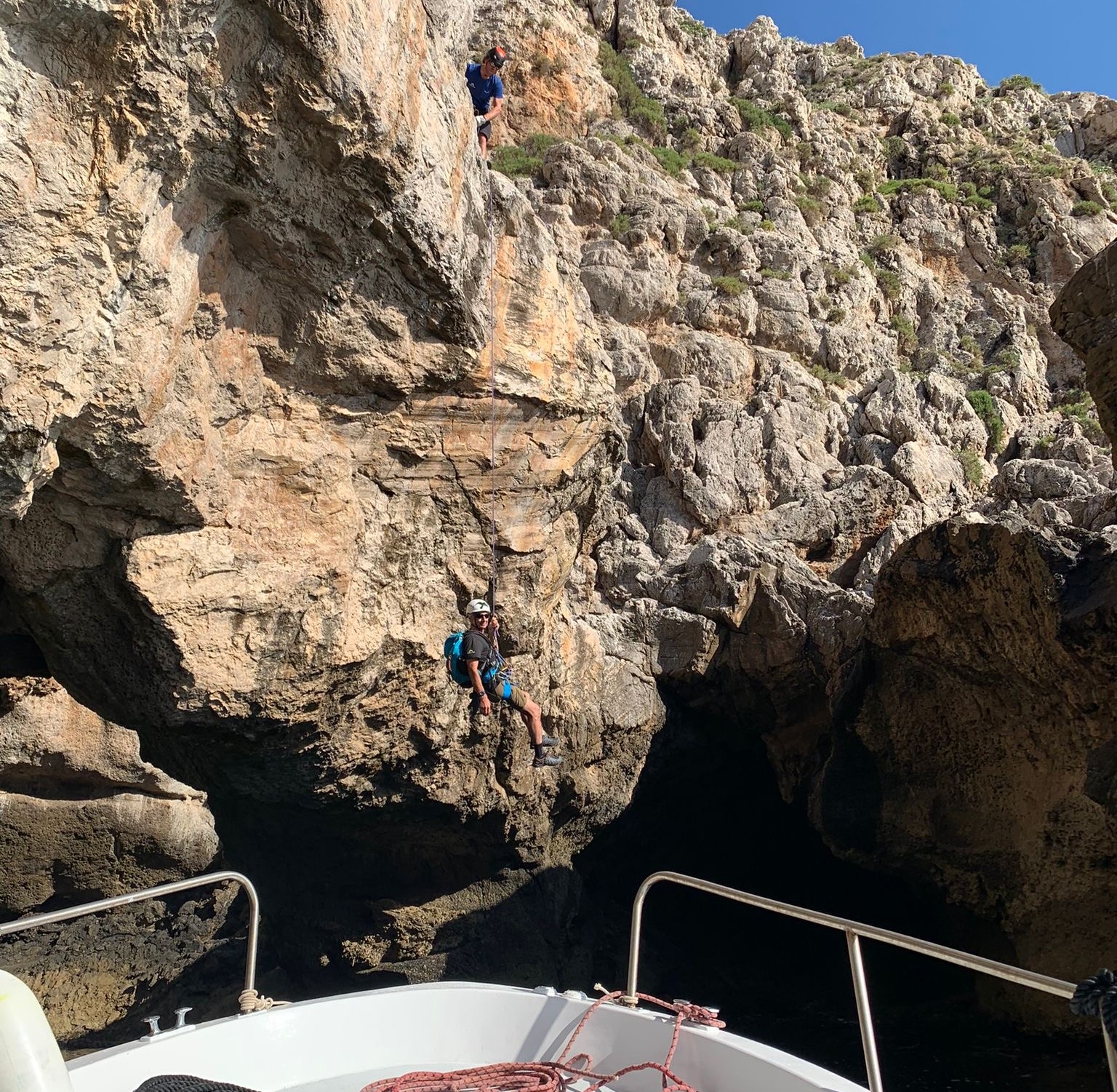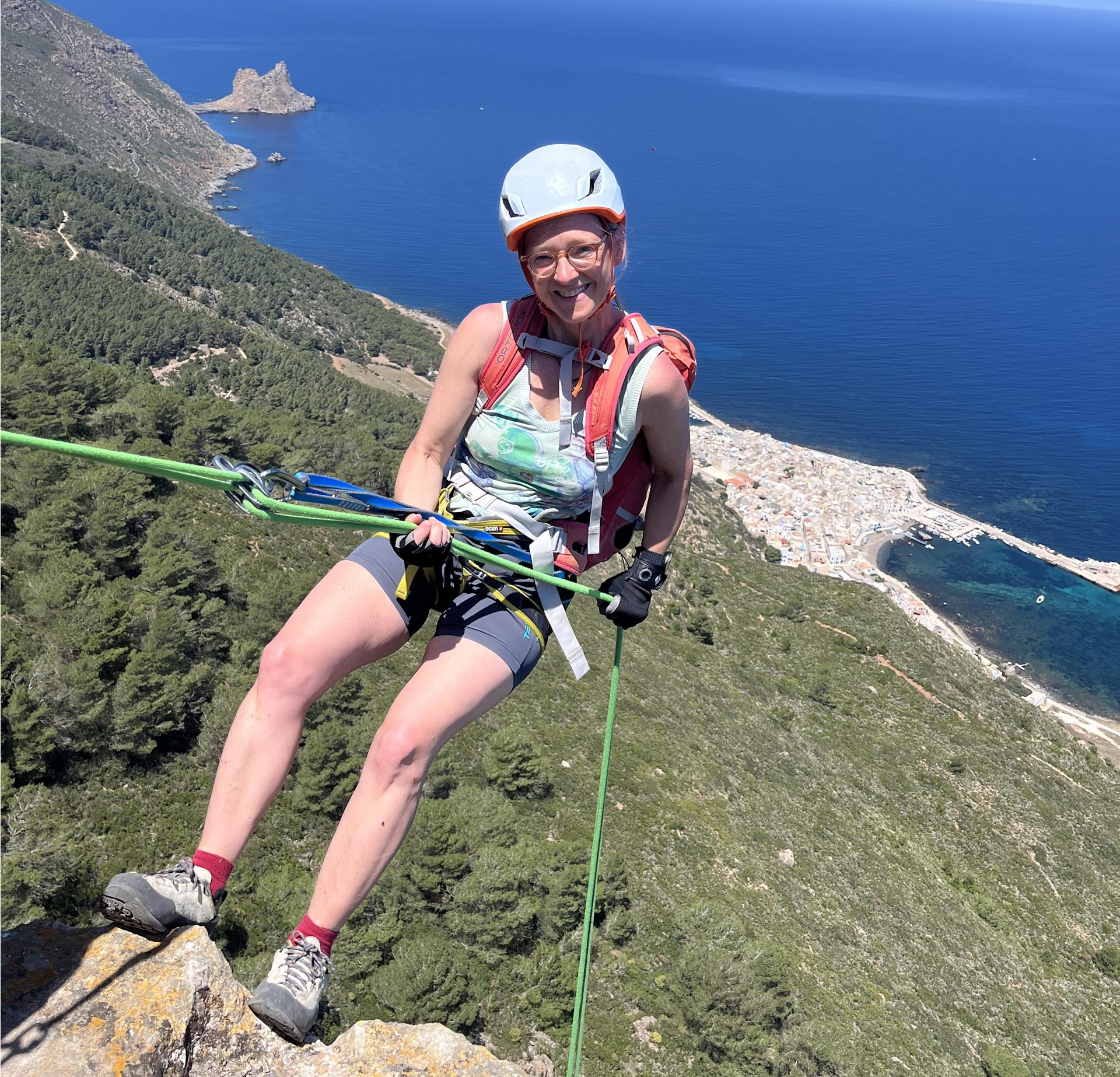 Mehrere Anläufe haben wir benötigt, um einen Weg durch diese wilde, unerschlossene Küstenlandschaft rund um die gesamte Insel zu finden. Einige Abseiler haben wir eingerichtet und es gilt einfache Kletterstellen zu bewältigen. Vor allem ist aber Schwindelfreiheit und Trittsicherheit angesagt, um auf den schmalen, ausgesetzten Bändern sicher unterwegs zu sein.