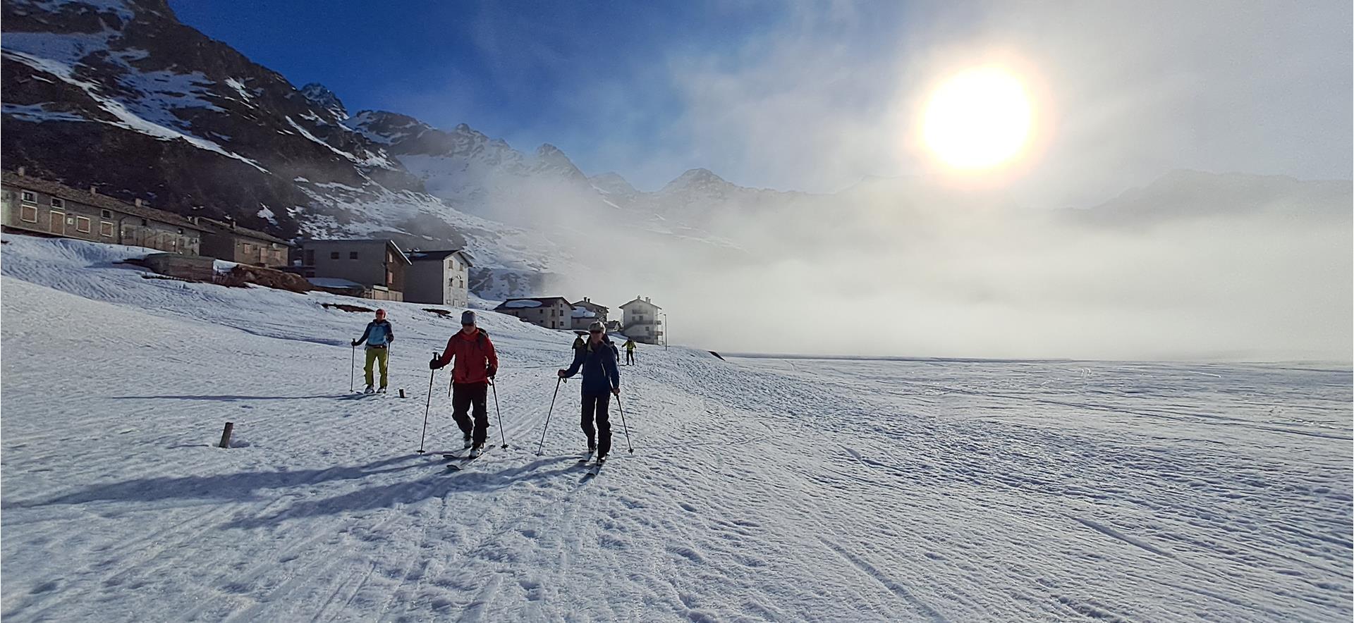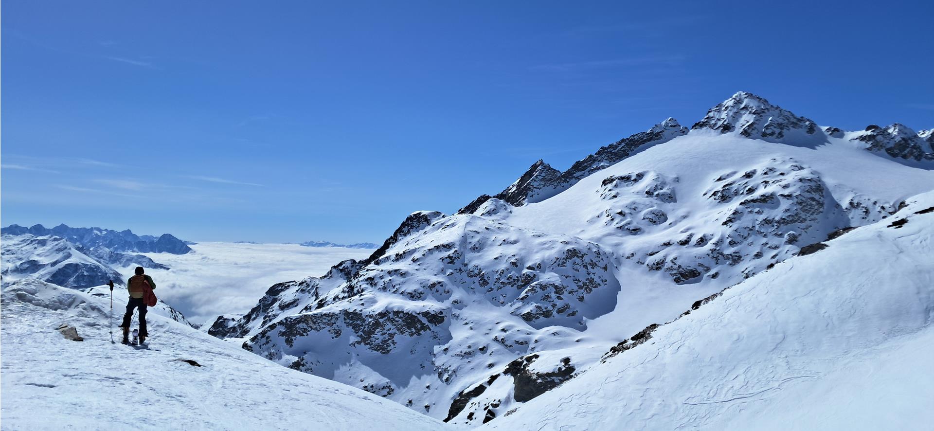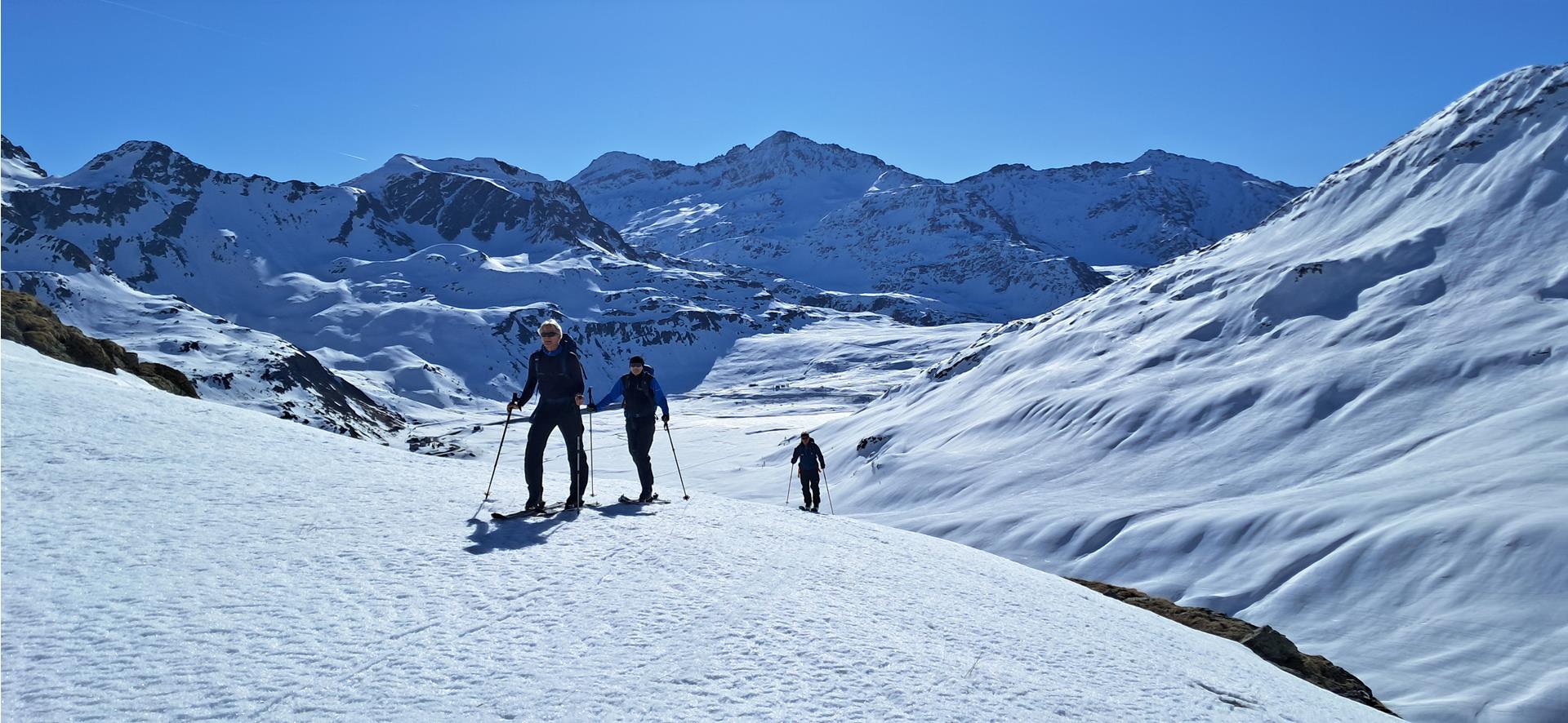 Einzigartig ist es auch deshalb, da fast alle Skitouren direkt vom Hotel aus begangen werden können. Genuss auf Spluga bedeutet: einzigartige Skitouren, verbunden mit hervorragendem Essen und erlesenen Weinen in gemütlichem Ambiente. Fast das gesamte Tourengebiet befindet sich oberhalb der Waldgrenze. Die herrlich weiten und freien Hänge sind dementsprechend im Frühjahr bei Firnverhältnissen am reizvollsten.
