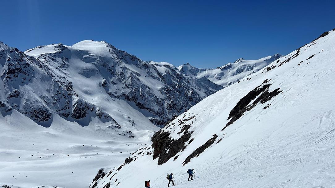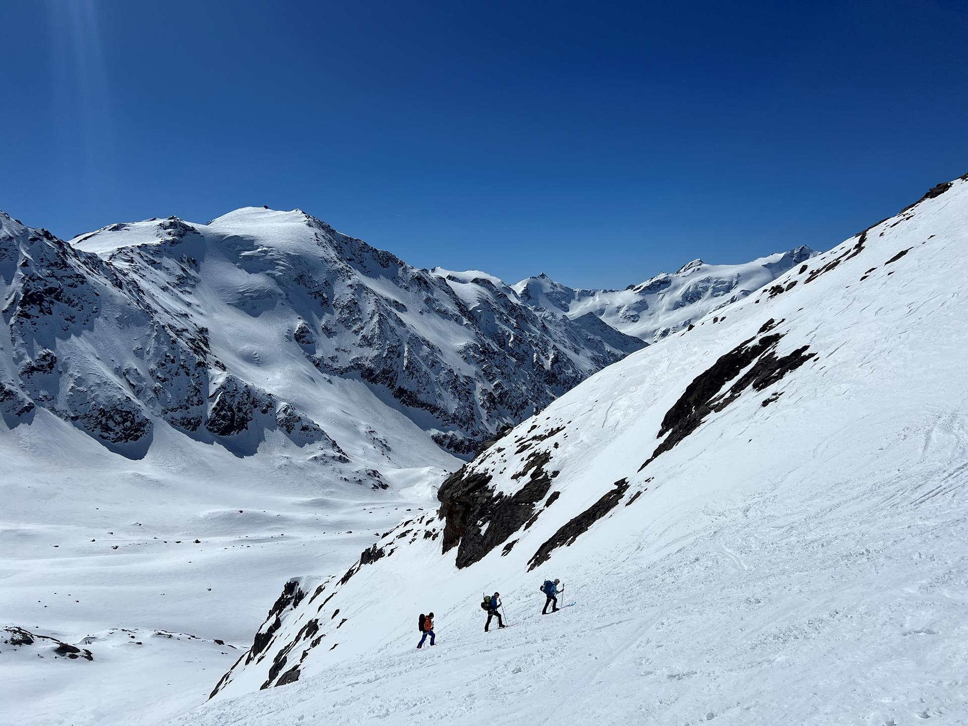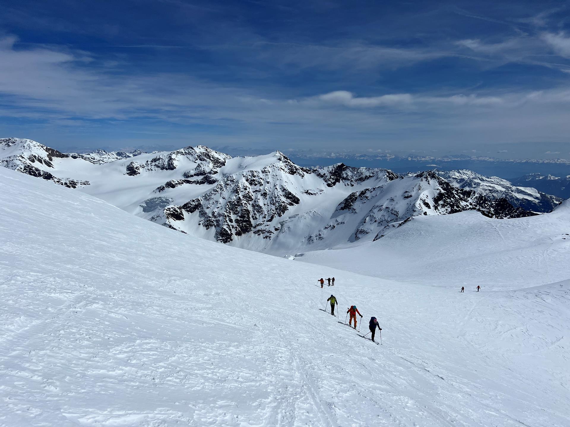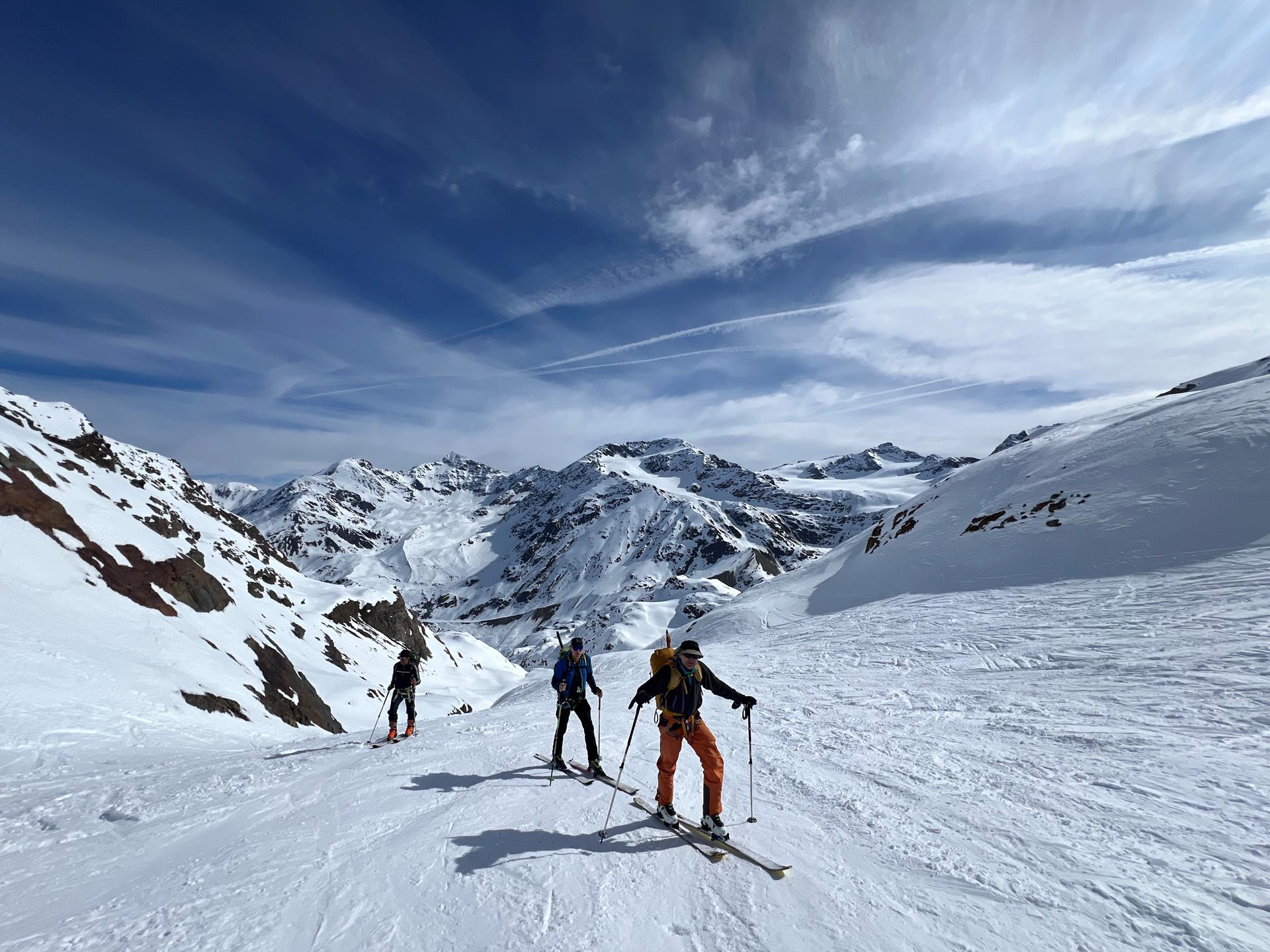 Die Höhenmeter pro Tag liegen zwischen 1.000 und 1.600 Hm, je nach Tourenwahl. Eine gute Kondition, sicheres Skifahren im freien Gelände sowie Erfahrung im Umgang mit Steigeisen und Pickel sind Voraussetzung – es handelt sich um eine fordernde Woche für ambitionierte Skitourengeher. Die kleine Gruppengröße von maximal 5 Personen ermöglicht dabei ein intensives Bergerlebnis und eine individuelle Betreuung.