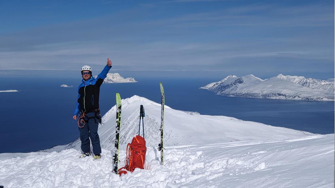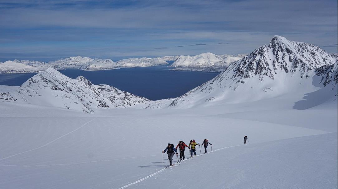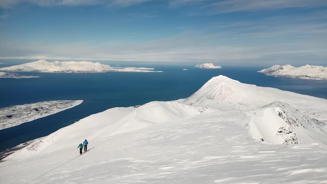 Skitouren nahe am 70° Breitengrad sind an sich schon etwas Besonderes, umso mehr wenn die Abfahrten bis zum Meer gehen. Glasklare Luft, der weite Blick übers Meer zu den nächsten Tourenzielen und ansprechende Skitouren sorgen für Begeisterung.