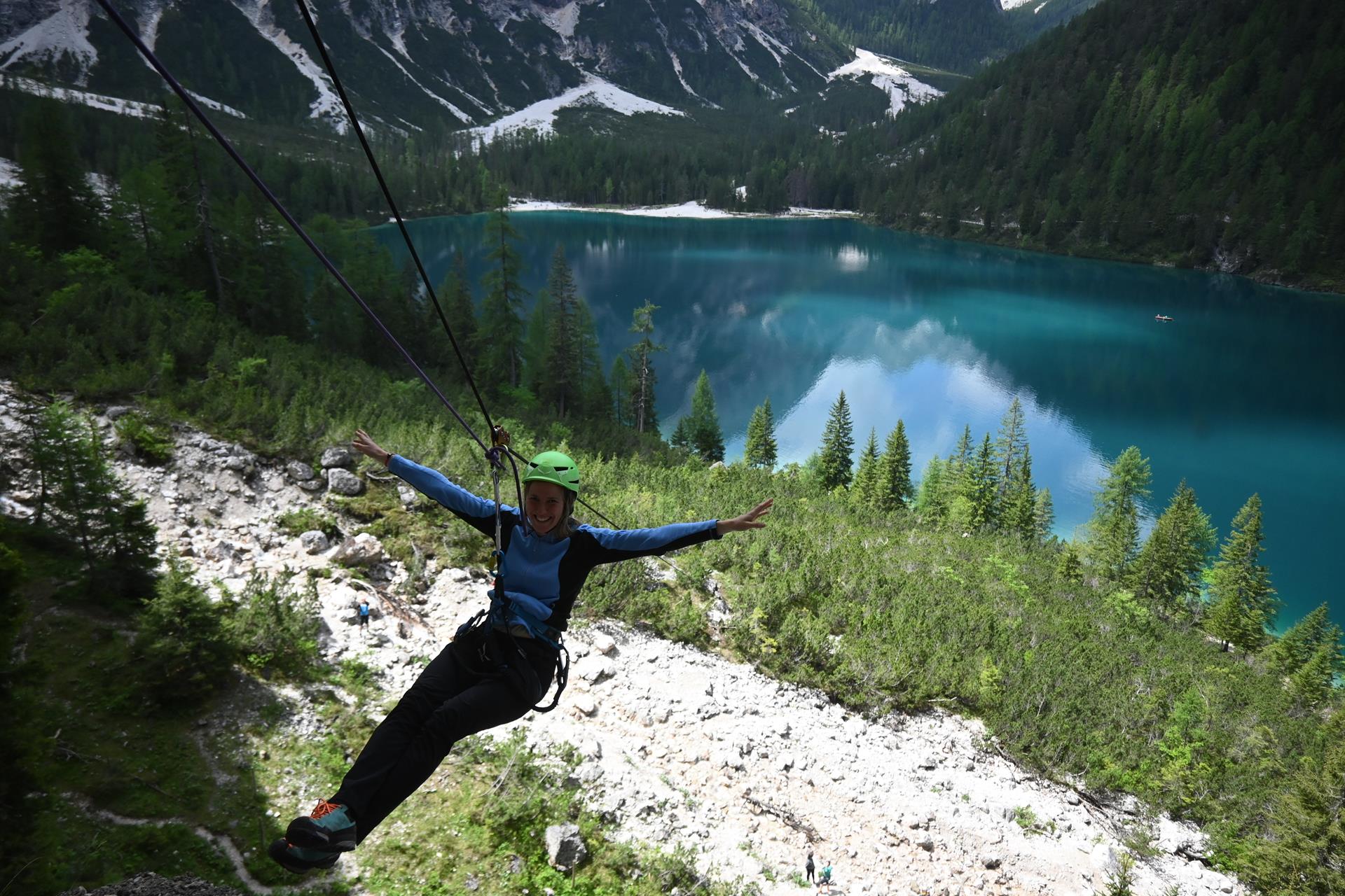 Chi non lo conosce il lago di Braies con le sue acque verdi e blu, cullato dalle pareti rocciose bizzarre delle Dolomiti? Ti va per arrampicarti, arrivati sull’altra sponda, su pareti di facile ascensione e di rimanere in sospensione tra le rocce assicurati dalla corda? Allora vieni con noi alla scoperta della montagna e della natura! Ci pensiamo noi al divertimento, all’adrenalina e all’avventura in un paesaggio davvero incantevole.